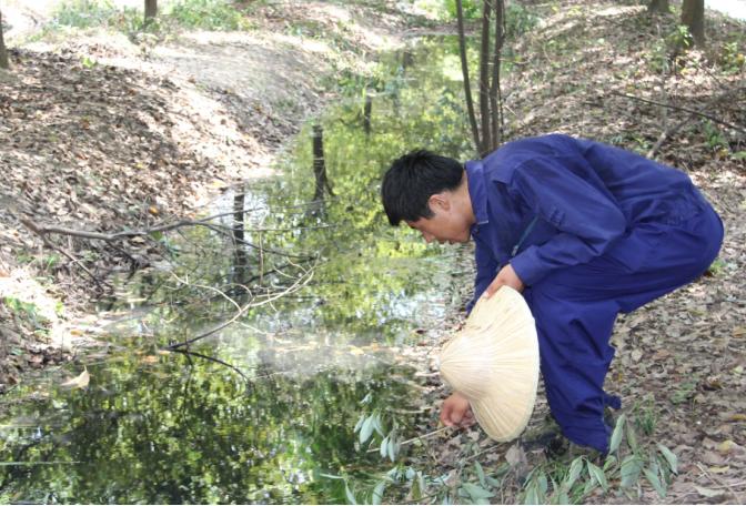 10:50,在81#标志桩附近的小树林里,沟里的水有些发黑,王师傅仔细查找根源,确定是旁边的染料废桶堆积场里流出来的废水。