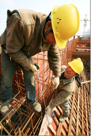 (图为一体化生物反应池建设工地上工人们在7米多高的脚架上搭建混凝土浇筑夹板。)
