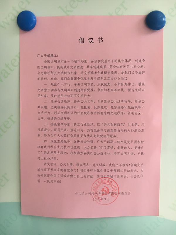 为动员集团全体党员干部职工积极参与创文活动,日前,集团党委发出倡议书,号召全体党员干部职工,积极行动起来,为绍兴创建全国文明城市作出应有的贡献。倡议书提议:集团全体党员干部职工要规范个人言行,争做文明市民;要维护公共秩序,提升公共文明;要擦亮窗口形象,树立行业新风;要深化志愿服务,促进社会和谐。