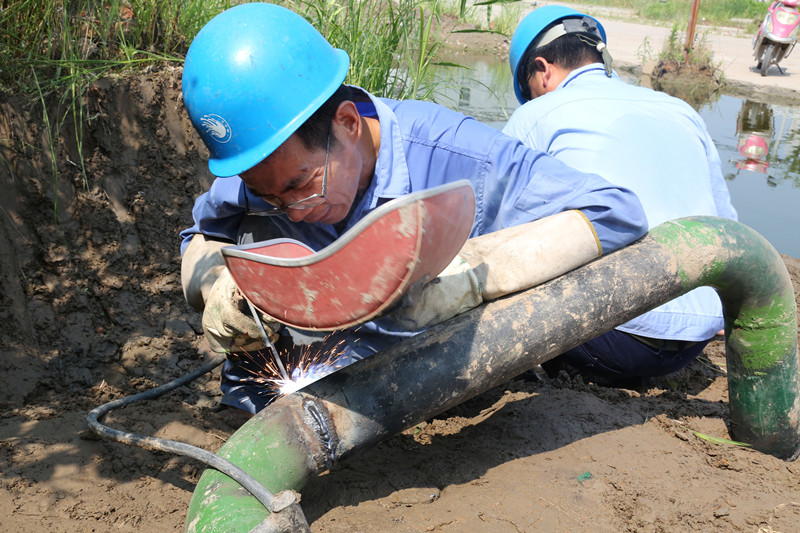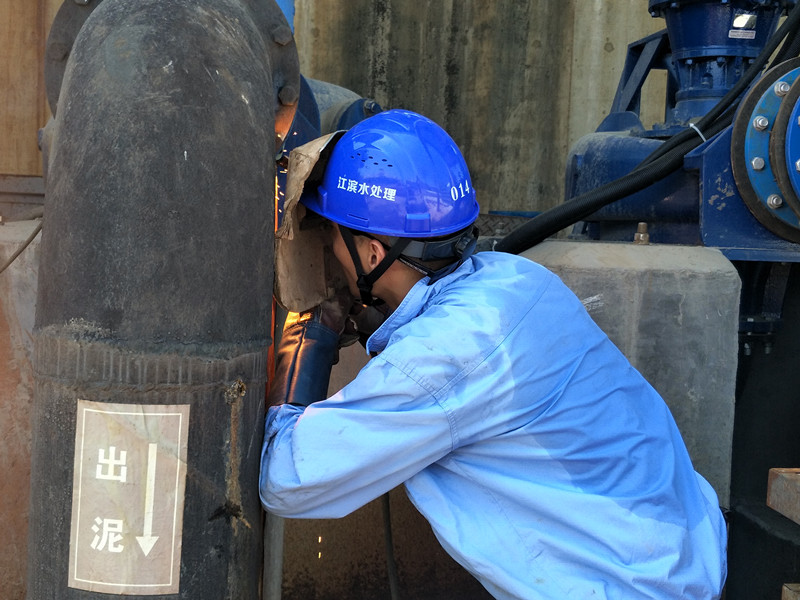江滨水处理公司设备部作业人员正对排泥管道进行抢修焊接作业,焊接时火花四溅,温度可以达到140℃左右。