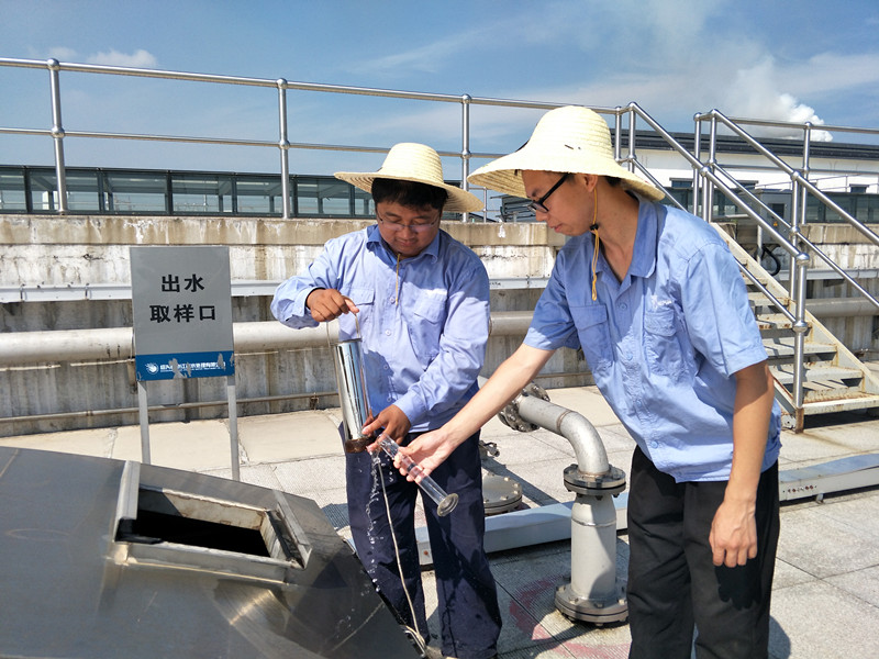 江滨水处理公司数米高的污水池上面,运行二部的两名职工顶着烈日取样。