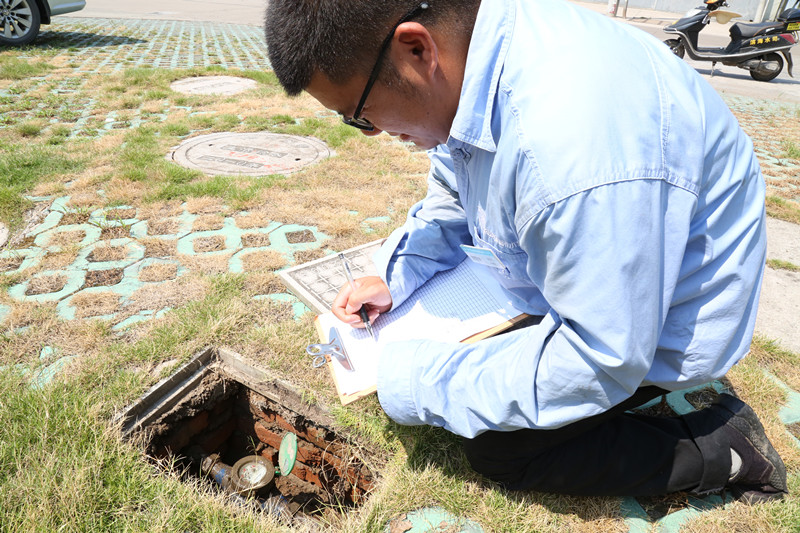 在室外火辣的太阳下,滨海供水公司抄表员一次次地抬起表盖,记录数据。