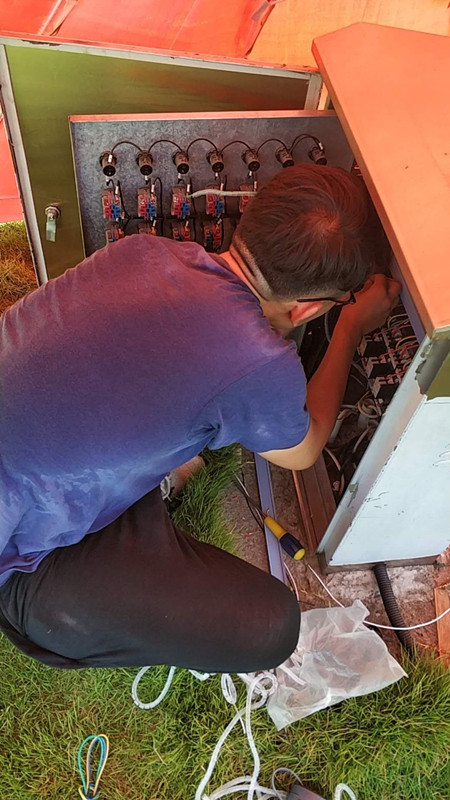 排水公司的自控维修人员在将近40℃的高温下安装自控设备,调试各项参数。