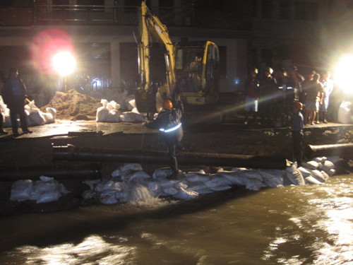 21点10分,抢险准备工作全部完毕,供水管道抢修工作正式开始。抢险队员分成两队实施抢修,在不到6米宽的狭长道路上,抢险队员在被湍急洪水冲刷掏空的路基上,冒着随时坍塌的危险,全然不顾个人安危冲锋在前,狂风大雨下,突击队只有一个信念:就是要抢时间,赶进度,尽快让全镇百姓第二天能正常用水!