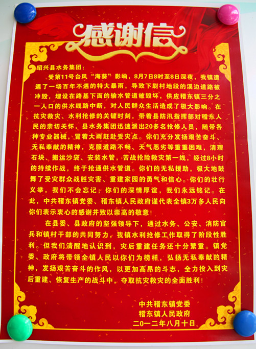 月17日,中共稽东镇党委、稽东镇人民政府专程为集团送来感谢信和锦旗,衷心感谢集团在第11号台风“海葵”期间,发扬艰苦奋斗、无私奉献精神,第一时间成功抢修被毁坏的输水总管,保障了该镇人民群众的饮水安全。