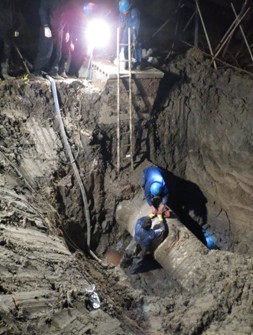 12月19日,公司中控室接到群众反映,329国道昌峰印染厂对面绿化带上有大量污水从地下冒出,公司领导及相关部门人员立即赶往现场。通过管位勘察、运行分析和污水状态等综合分析后确认为公司钱一至钱二DN800砼管泄漏。当即,维修人员奋力抢修,出动移动发电机、挖掘机等大型机械上阵,由于整个抢修计划得当,措施有力,仅仅7个半小时,顺利完成抢修任务。